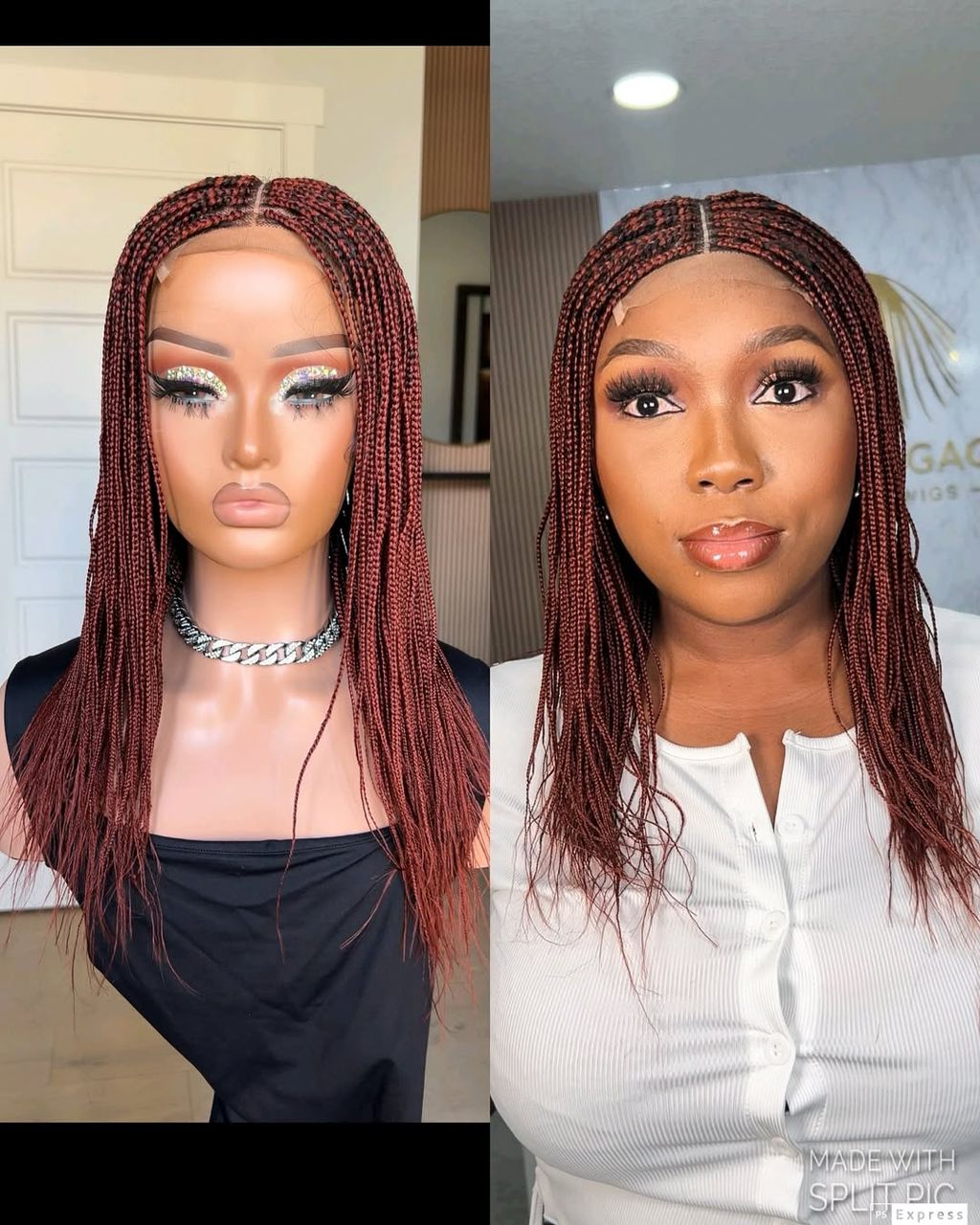 The Normal Size Braided Bob offers the perfect balance of volume and weight. Featuring medium-sized braids, this wig provides a full-bodied look that beautifully mimics natural hair. The feathered bob cut ensures you stay cool and stylish, while the high-quality synthetic fibres prevent tangling and maintain their sheen.