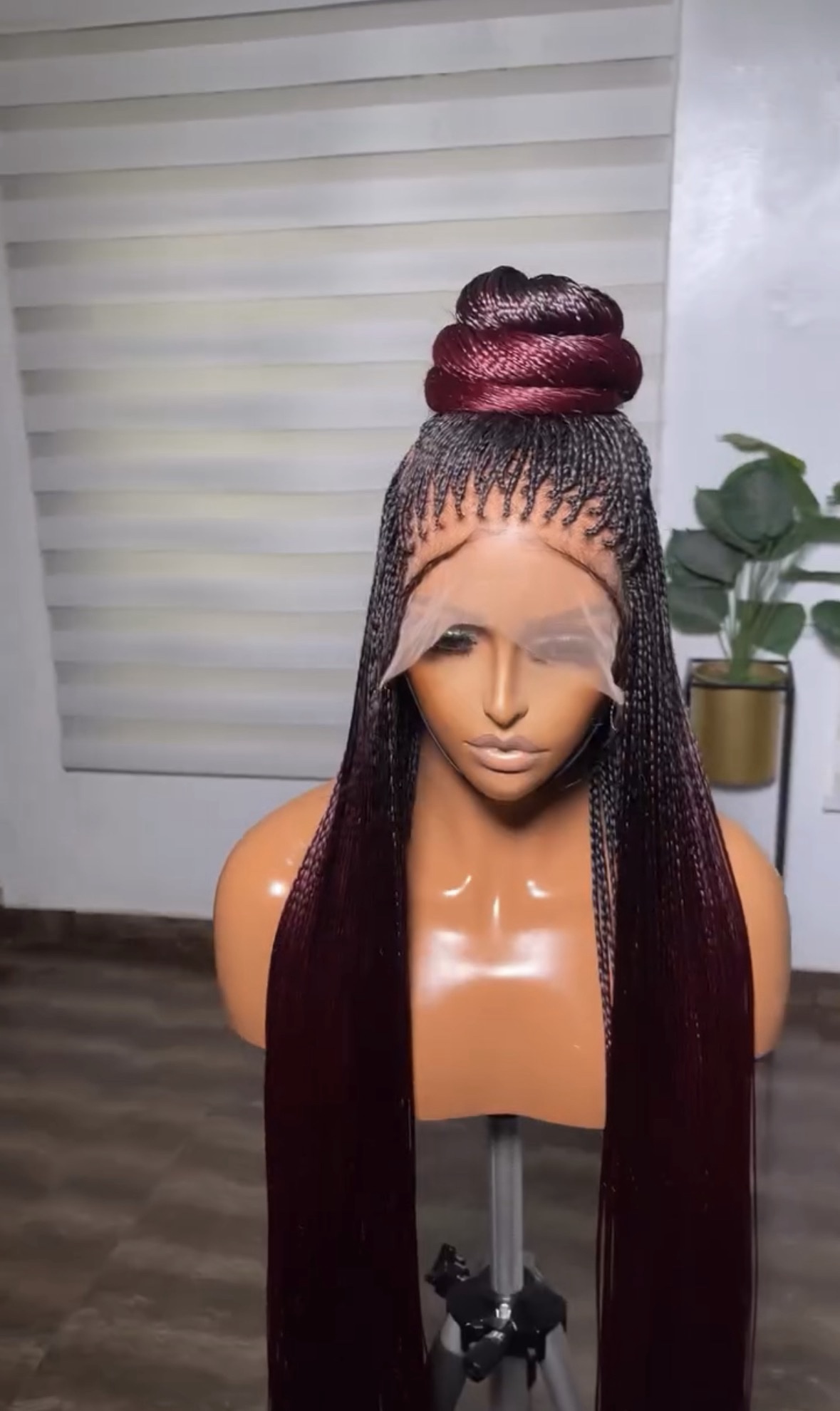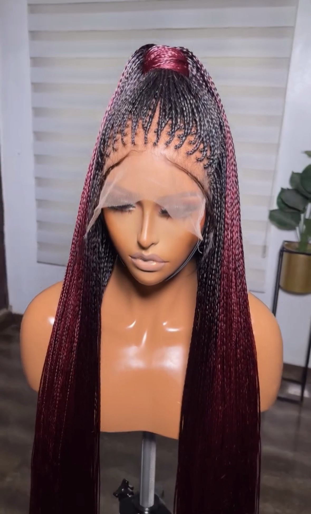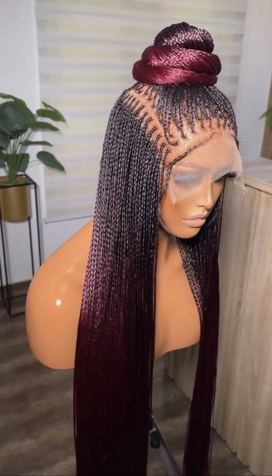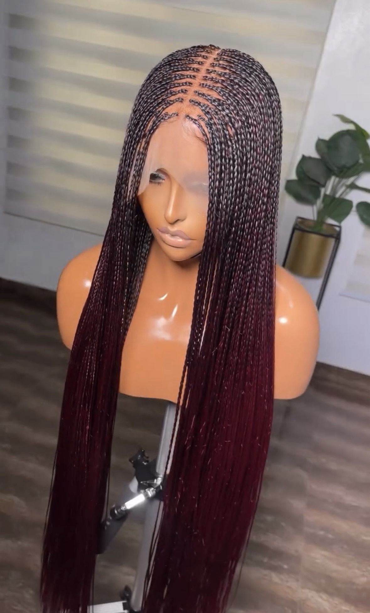 Elevate your style game with our Ombre Knotless Box Braid Lace Front Wig — a meticulously handcrafted masterpiece designed for women who want luxurious length, bold color, and a flawless natural finish. This unit features ultra-fine micro knotless braids that transition beautifully from a deep black root (1B) into a rich, vibrant burgundy (99J), creating a dimensional ombre effect that looks stunning in any lighting.