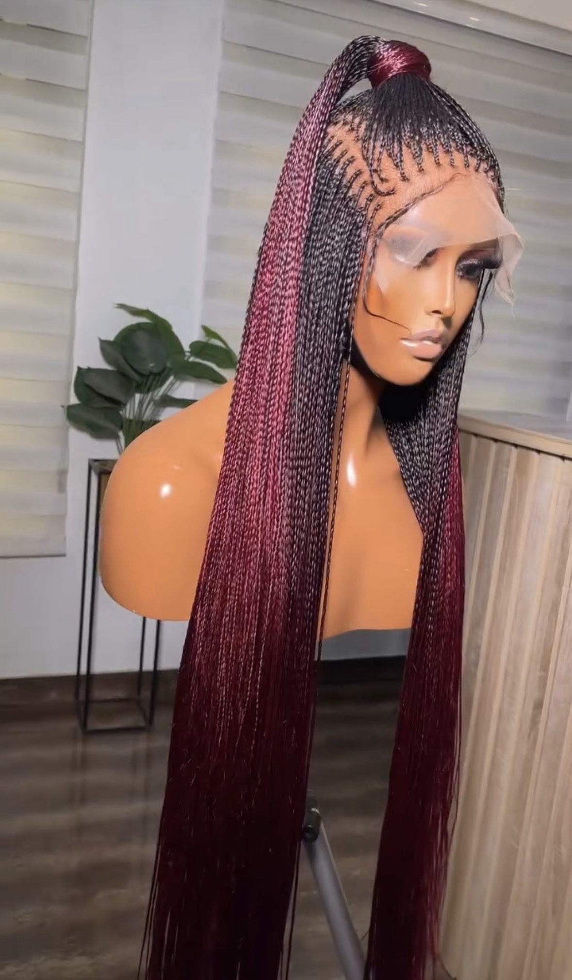 The full lace construction allows for versatile parting and styling, while the transparent lace front blends seamlessly into all skin tones for an undetectable, natural hairline. The braids are gathered into an elegant high-ponytail finish at the crown, adding a chic, editorial touch that sets this unit apart.