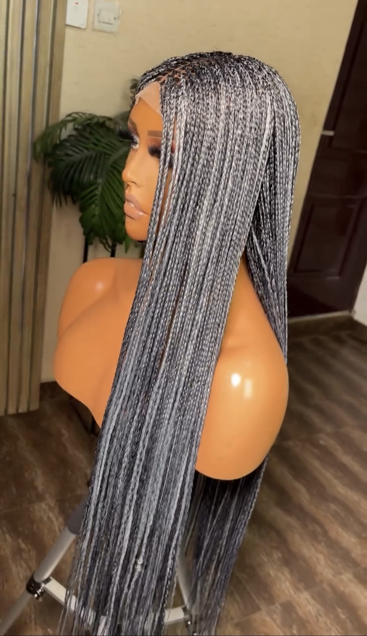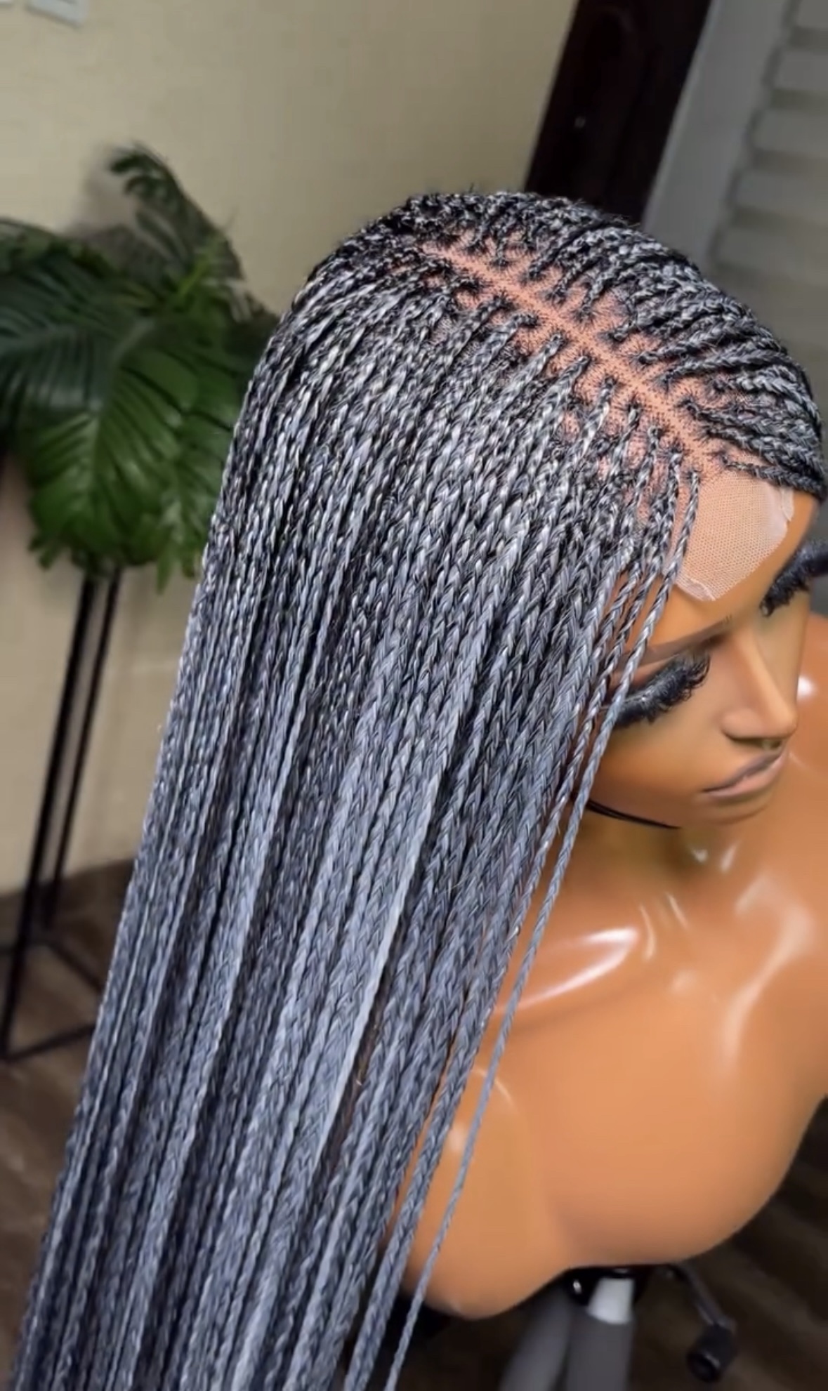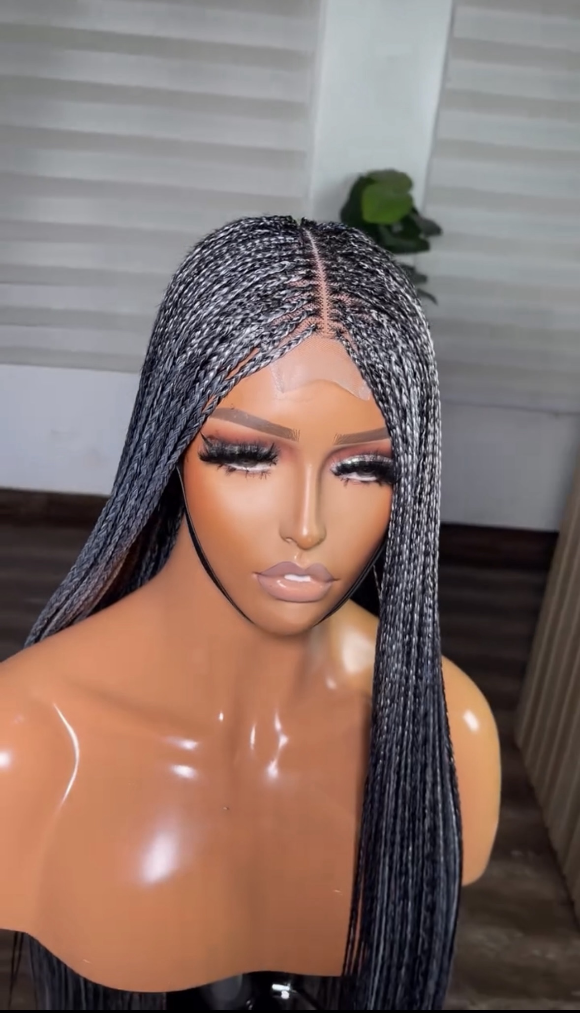 Embrace a bold, refined look with our Salt & Pepper Micro-Braided Lace Front Wig. This unit features a stunning “iced” color palette, meticulously blending deep black and shimmering silver synthetic fibers for a multi-dimensional finish. Perfect for those who want a distinguished, high-fashion protective style.